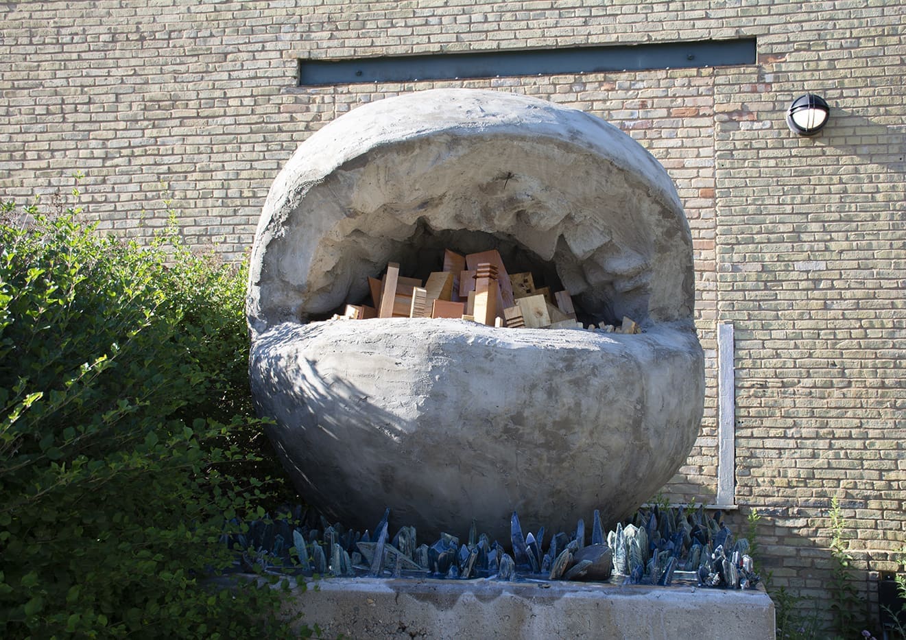 City Geode, created and installed in May 2019 by students and Professor Josh Zeis from NDSU is the latest creation. In response to the work, the lead artists said, “What is a city? This City Geode incorporates many of the things that we thought a city needs; buildings, streets, electricity, drainage, and above all else, the human spirit. We each put a piece of ourselves into this sculpture. As a result, it has captured our humanity, with beauty in all of its flaws and imperfections.” Plains Art Museum would like to thank all of the artists involved in the creation of City Geode.